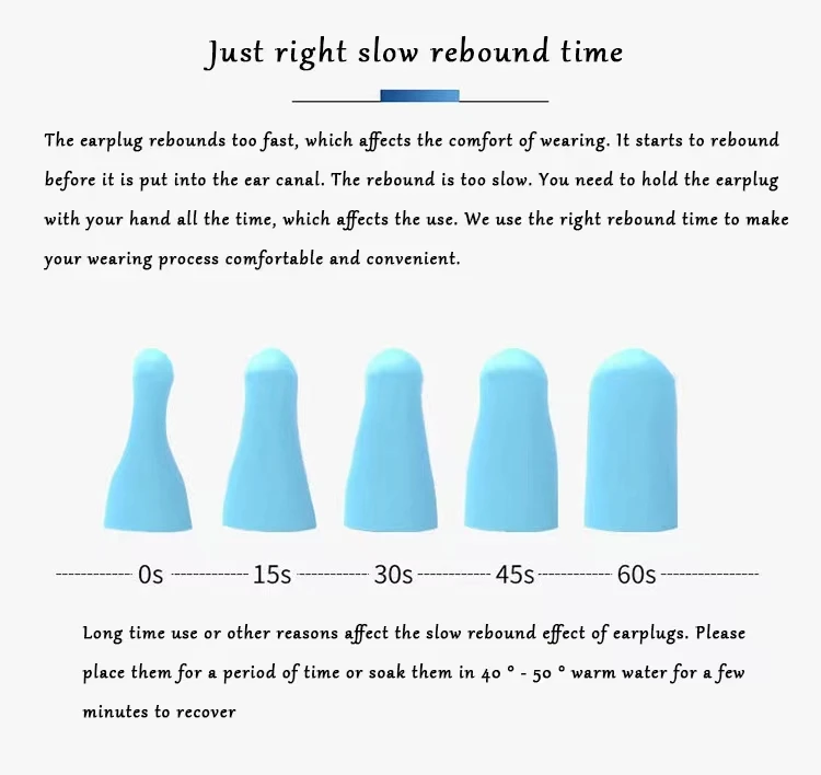 • Slow Rebound :The slow rebound feature of these earplugs ensures a gentle release when removed, preventing any discomfort or disruption to your sleep.